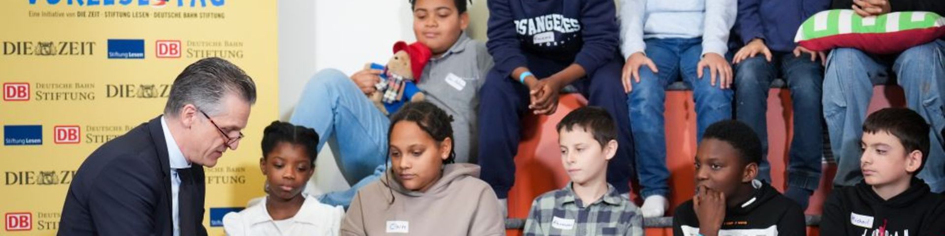 Kanzleramtsminister Thorsten Frei war zum Vorlesetag ebenfalls an der Robert-Reinick-Grundschule in Berlin und las vor. Er übergab gemeinsam mit den Initiatoren des Aktionstags – Dr. Rainer Esser, CEO der ZEIT Verlagsgruppe, Dr. Jörg F. Maas, Hauptgeschäftsführer der Stiftung Lesen und Martin Seiler, Vorstand Personal und Recht Deutsche Bahn AG und Beirat der Deutsche Bahn Stiftung – eine Lese-Box mit spannenden neuen Büchern an die neugierigen Schüler:innen.